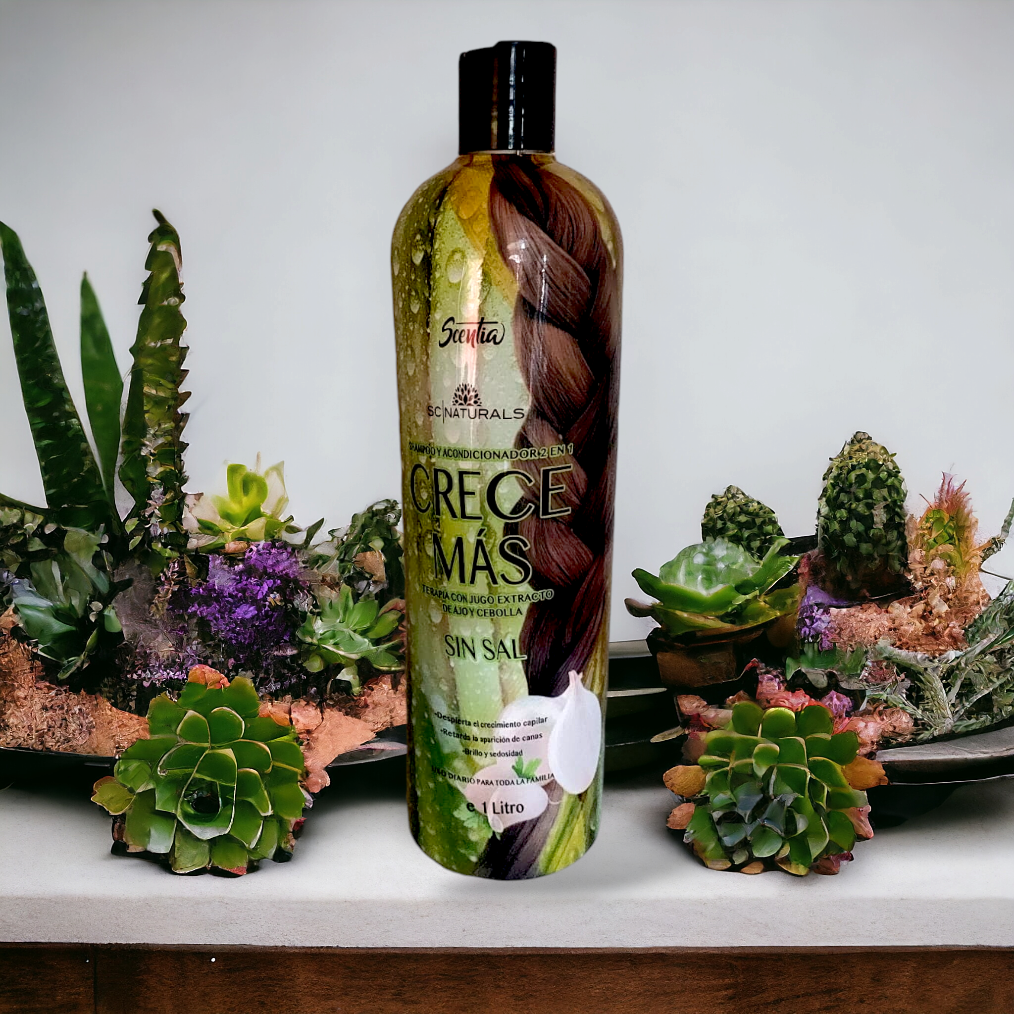 | Presentación | Crese más anticaspa (1 L), Con triple acondicionador, extracto de cola de caballo (1 L), Crece más, terapia con jugo extracto de ajo y cebolla (1 L), Crese más activador 1. Lt |